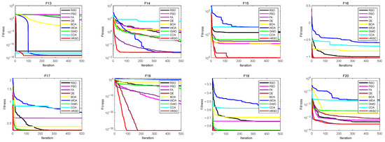 This section evaluates the HRSO using benchmark functions F1 through F20. F1F7, listed in Table 1, are unimodal functions that are employed to evaluate the algorithm’s performance when there is only one global minimum. F8F13, listed in Table 2, are multimodal functions that are employed to evaluate the algorithm’s performance in searching for a global solution in the case of numerous local minimums. F14F20, listed in Table 3, are fixed-dimension multimodal functions that are employed to evaluate the convergence of the algorithm under low-dimensional problems.