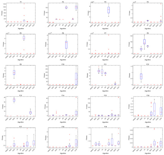 Figure 4. Boxplot of HRSO, RSO, PSO, FA, DE, BOA, WOA, GWO and COA.