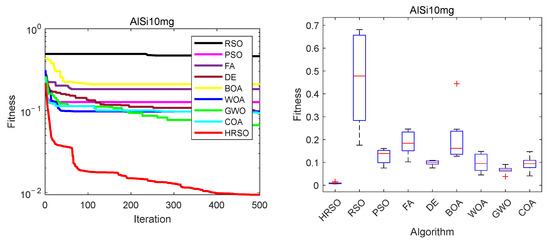 Figure 5. Convergence graphs and boxplots of HRSO, RSO, PSO, FA, DE, BOA, WOA, GWO and COA.