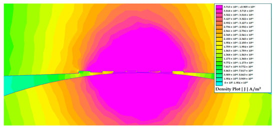 Figure 3 illustrates a simulation incorporating the actual geometry of the contact material, where the current density is elevated at the edges of each recessed channel. These localized regions may act as preferential sites for arc initiation. As the current density increases at these points, they experience the highest levels of Joule heating, potentially accelerating material degradation and erosion. The results are similar to those in other studies [