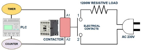 Arc-induced contact degradation was studied using a custom-built automated switching system designed specifically for this investigation. The setup integrates a programmable logic controller (PLC), an industrial Ag–Ni 90/10 alloy 3-pole contactor rated at 3.3 kW, and a 1200 W resistive load supplied by a 230 V AC source, resulting in a contact current of approximately 5.2 A. The contactor applies a contact force of approximately 30 N, representative of typical industrial devices. The system cycles the contactor under load with a fixed timing sequence of 2 s ON (coil energized, contacts closed) followed by 2 s OFF (coil de-energized, contacts open), completing one full switching cycle every 4 s. The PLC controls the timing, counts each cycle, and automatically halts the test after 9000 cycles. Although the bulk contact temperature remained near ambient, localized arc-induced heating at the contact interface led to contact welding, highlighting the conditions under which degradation occurs.