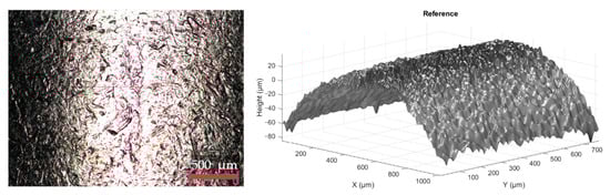 The evolution of surface roughness and morphology in Ag–Ni electrical contacts was investigated over 0 (reference), 3000, 6000, and 9000 switching cycles using combined optical microscopy and 3D profilometry. The reference surface exhibited a baseline roughness of Ra = 23.35 µm and Rq = 27.57 µm, consistent with the inherent micro texture of the Ag–Ni sintered alloy. The reference surface in 2D and 3D can be seen in