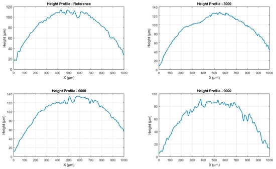 Figure 9, of the Ag–Ni contact surfaces reveal distinct morphological changes with increased usage cycles. The reference profile shows a smooth, symmetric curvature with height variation ranging approximately from −20 µm to +35 µm, indicative of the original surface micro texture. After 3000 cycles, the profile exhibits a marked increase in peak height, reaching over 110 µm, reflecting localized surface protrusions and arc erosion consistent with the hourglass wear pattern. At 6000 cycles, the height profile further intensifies, with peaks exceeding 130 µm and noticeable flattening near the edges, indicative of material redistribution and deposit buildup around the contact area. Conversely, the 9000-cycle profile demonstrates a substantial reduction in height variation, returning closer to baseline levels (~−10 to +30 µm), suggesting surface smoothing due to progressive coverage by carbonaceous films and mechanical burnishing. These trends corroborate the nonlinear wear mechanism where initial arc erosion and material deformation are followed by deposition and surface homogenization, ultimately impacting contact reliability.