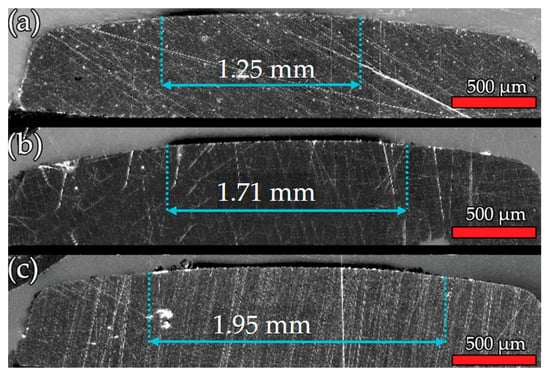 The width of the affected region progressively increases from 1.25 mm in (a) to 1.71 mm in (b), and further to 1.95 mm in (c), representing a total increase of approximately 56% from (a) to (c). This widening is attributed to the mechanical pressure applied by the contactor, which induces surface deformation and promotes expansion of the affected zone. Correspondingly, the surface shows increasing accumulation of a carbonaceous deposit, predominantly localized along the edges. This deposit forms a relatively smooth and continuous layer with an irregular boundary that conforms to the surface morphology. The thickness and coverage of the carbonaceous layer increase from (a) through (b) to (c), reflecting enhanced deposition due to prolonged or intensified frictional contact coupled with mechanical stress. These combined effects contribute to the evolving surface morphology and tribological characteristics of the material.