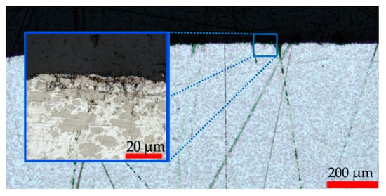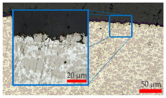 Figure 12. The Ag–Ni electrical contact after 3000 operational cycles exhibits a relatively shallow damaged zone, with an estimated residual layer thickness of ~8–12 µm and minimal porosity. The surface–substrate interface is smooth, and the underlying grain structure remains largely intact, indicating an early localized erosion phase dominated by limited arc-induced melting and rapid resolidification. Defect density is low, with few isolated dark inclusions likely corresponding to oxide or contaminant particles. This stage reflects an initial wear regime in which electrical conductivity and mechanical cohesion are largely preserved, and welding propensity remains minimal.