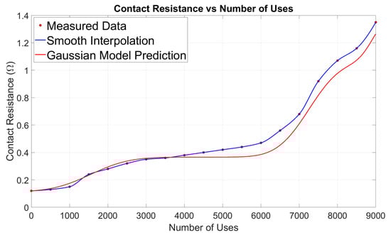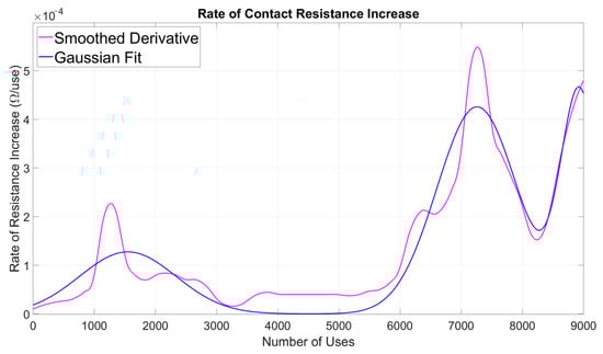 The rate of contact resistance increase for the Ag–Ni contact demonstrates a multi-modal behavior across its usage lifetime. An initial moderate peak around 1000 uses suggests early-stage surface changes, likely due to initial wear and formation of oxide films. This is followed by a prolonged phase of low and stable rate from roughly 2000 to 6000 uses, indicating a temporary equilibrium in contact surface conditions. Beyond 6000 uses, a pronounced and sharper peak emerges near 7000–7500 uses, representing accelerated degradation possibly driven by rapid oxide growth, increased surface roughness, and mechanical wear. A third, smaller but distinct peak near 8300 uses indicates localized wear mechanisms or microstructural changes prior to the contact’s end-of-life. The Gaussian fit accurately models these distinct degradation stages, reinforcing the presence of separate physical processes influencing the resistance increase rate during extended usage.