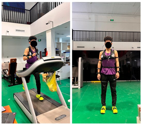 During the incremental load phase, subjects were equipped with an inertial motion capture system, the Perception Neuron Studio (PNS, Noitom, Beijing, China), prior to initiating a graded treadmill test. The initial velocity was set at 6 km/h for female participants and 7 km/h for males, with incremental speed increases of 1 km/h every 3 min until volitional exhaustion or failure to maintain pace. BLa samples were obtained via fingertip puncture within 30 s after each stage []. Post-experiment analysis was conducted using a lactate analyzer (Biosen C-Line, EKF Diagnostic GmbH, Barleben, Germany) to quantify BLa concentrations. The experimental procedure and device configuration are depicted in Figure 1.