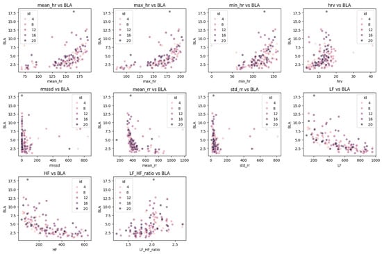 The analysis revealed that LF, HF, and max_hr exhibited the strongest correlations with BLa, with Pearson’s coefficients of −0.75, −0.73, and 0.65, respectively. Based on these findings, they were selected as input features in subsequent modeling. The complete correlation coefficients for all examined indicators are presented in Table 1, with scatterplots shown in Figure 3.