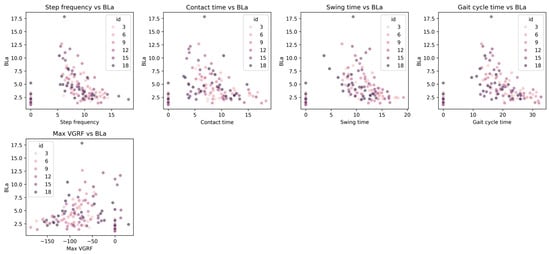 Gait cycle parameters showed strong linear associations with BLa, with Pearson’s coefficients exceeding 0.71, although these were not statistically significant (p > 0.05). Detailed results are summarized in Table 3, and corresponding scatterplots are presented in Figure 5.