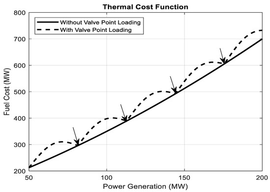 where is the total cost of all generating units, is the number of thermal generators, is the number of wind farms, is the number of wind generators, and is the active power for thermal generators. The cost function is for thermal generator units. It is formulated using a quadratic function without a valve-point loading effect and is given in Equation (2) [15]. The thermal cost function can be presented with or without a valve-point loading effect, as shown in Figure 1. The arrows in Figure 1 represent the loading of the thermal generators.