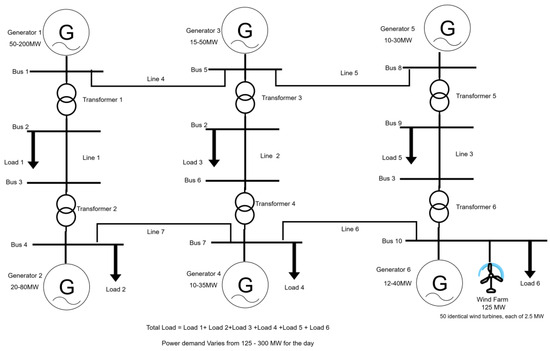 In studies [5,6,7], the formulation of the wind–thermal economic emission dispatch (WTEED) problem included the quadratic cost function with a valve-point loading effect, and modeled the wind power with PDF. The underestimation and overestimation of wind power availability are incorporated into the fitness function and the direct cost function of wind power, which depend on the ownership of the wind farm. The emission cost function is represented in terms of the quadratic cost and an exponential function. Ref. [5] uses a modified 30-bus system having six thermal units. Wind generators replace the last two units. Ref. [6] uses two conventional test systems, including 6 and 40 thermal generators, with two wind farms with penetratiosn of 10 MW and 100 MW, respectively. Lastly, ref. [7] utilizes a test system configured as described in [1].