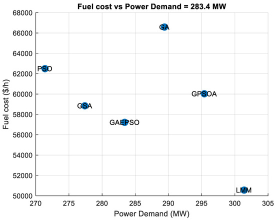 In electric power systems, losses are mainly caused by the transportation of electric power over a long distance, or in the case of relatively low load density, vast areas, and it is necessary that the transmission losses be included in the formulation of the problem for wind–thermal dynamic economic dispatch. In [18], the transmission loss formula is given by the first quadratic term of Equation (6), and it was later called George’s formula. The equation is also called the loss formula or B-coefficient method. To obtain a more accurate transmission loss equation, a linear term and a constant are added to the quadratic expression [18]; this is called Kron’s formula and is given in Equation (6) [19,20]. The B-coefficient method enables the coordination of power loss in scheduling the output of each plant for maximum economy for a given load.