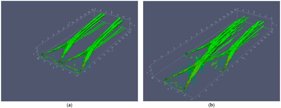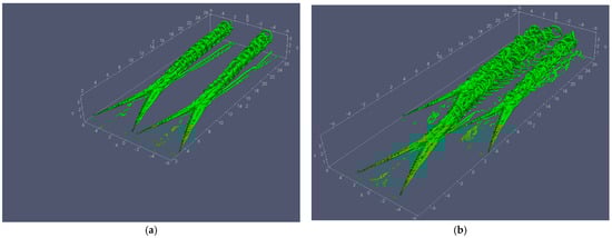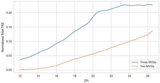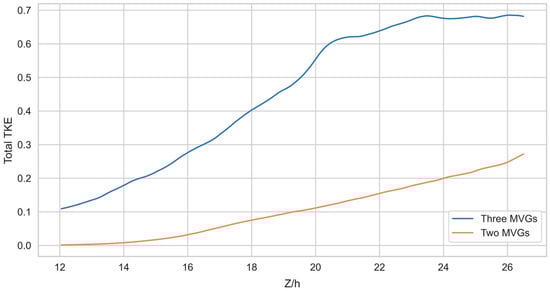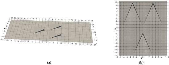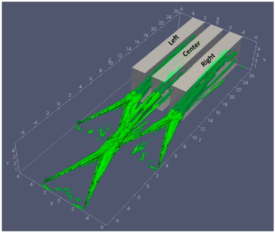 - The three-MVG case: Three MVGs are arranged with two MVGs positioned identically to the Two-MVG case and a third MVG placed upstream at the midpoint between them, with a streamwise offset of 3h, see Figure 2. The computational domain spans in the spanwise (X), wall-normal (Y), and streamwise (Z) directions, respectively, with a grid resolution of 269 × 200 × 1091.