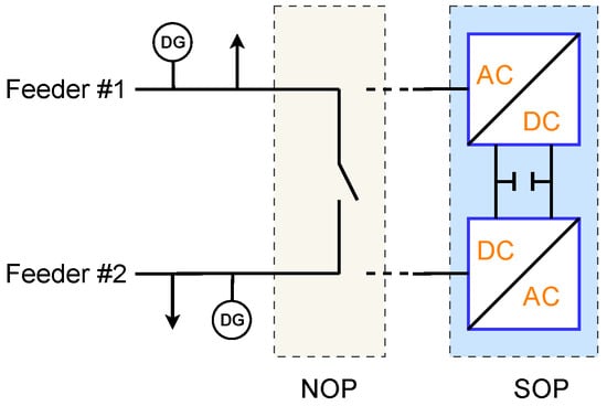 A SOP is a power electronic device that replaces traditional mechanical tie-switches at normally open points in distribution networks [6], as shown in Figure 1. Both terminals of SOP are voltage source converters (VSCs), and are decoupled by the DC capacitance. Owing to the DC isolation, each terminal of SOP can be controlled independently, thus enabling fast and continuous control of active and reactive power flow between two terminals, improving voltage profiles, reducing network losses, and facilitating higher DER penetration. Preliminary studies have investigated the application of SOPs in distribution system operation. For instance, ref. [7] integrates SOPs to enhance voltage stability and reduce losses, while the author of [8] employs SOP for imbalance mitigation in ADNs. In [9], a coordinated control strategy between SOPs and energy storage systems is proposed to improve operational flexibility. Under normal operating conditions, SOPs have demonstrated effectiveness in network reconfiguration and optimal power flow management [10]. Furthermore, stochastic and robust optimization techniques have been applied to optimize SOP placement and operation under renewable generation uncertainty [11,12,13].