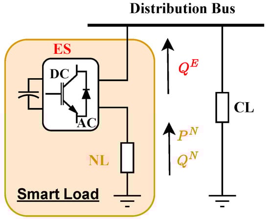 ES is an advanced power electronics apparatus deployed on the demand side, installed between a distribution bus and non-critical loads (NLs). The main structure of ES is a voltage source inverter (VSI), making it both cost-effective and highly responsive in voltage and reactive power control, as shown in Figure 2. Unlike conventional compensators, the ES exclusively regulates reactive power, eliminating the need for costly active power converters [14]. When combined with NLs, the series structure forms a smart load (SL), operating in parallel with critical loads (CLs) to enhance grid efficiency [15]. In ADN with ESs, NLs refer to electric loads that can undertake relatively wide voltage and power variations. On the other hand, CLs require a stable power and voltage supply. By adjusting the voltages of ESs and NLs, ESs can provide real-time voltage support and absorb surplus renewable energy. This makes ES particularly suitable for applications in systems with high penetration of distributed PV units. The concept was first introduced in [16], where the fundamental operating principle and circuit topology were established. Since then, various control strategies have been developed to improve ES performance. Droop and distributed control methods are proposed in [17,18] for voltage regulation in low-voltage networks with high PV integration. In [19], ESs are utilized to improve ADNs’ efficiency through loss reduction and voltage flattening. Additional benefits of ESs include enhanced system flexibility [20], resilience [21], imbalance mitigation [22], and frequency support [23].