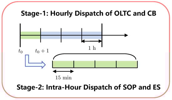To leverage the complementary strengths of legacy mechanical devices and fast-responding power electronics, this paper proposes a two-stage stochastic coordination framework, as illustrated in Figure 3. The conventional hourly operation period is divided into four 15-minute intervals, establishing a two-timescale coordination strategy: long-term (1 h) for OLTC and CB dispatch and short-term (15 min) for SOP and ES control. The long-timescale decisions (OLTC taps, CB switching) are treated as first-stage (“here-and-now”) variables, fixed for the entire hour. The short-timescale responses (SOP active/reactive power output, ES reactive support) are second-stage (“wait-and-see”) actions, adjusted dynamically to compensate for intra-hour uncertainties. The overall problem is formulated as a two-stage stochastic program, as follows: