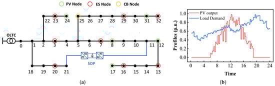 (a) The modified IEEE 33-bus test system. (b) The 15 min profiles of PV output and load demand.