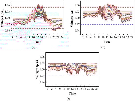 Voltage profiles under different scenarios. (a) ADN without regulation. (b) ADN with hourly regulation of OLTC and CB. (c) ADN with the proposed two-stage stochastic coordination strategy.