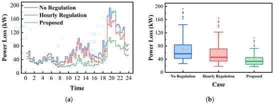 Figure 7 presents a comparison of power losses in the test network under different operational scenarios. As shown, power loss reaches its peak during high-demand periods due to heavy loading on the distribution lines. Similarly, during periods of peak PV generation, reverse power flow can also lead to increased losses. In the absence of any regulation, power losses are the highest across all time intervals, exceeding those observed under both the hourly regulation scheme and the proposed two-stage strategy. Both during peak demand and peak generation periods, the proposed strategy achieves the lowest power loss. Moreover, throughout the remaining operating periods, it consistently maintains lower losses compared to the other cases.