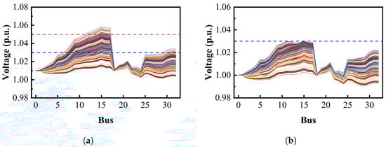 Voltage profiles of different strategies under random scenarios. (a) Single-stage strategy. (b) Proposed two-stage stochastic coordination strategy.