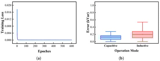 The MLP is trained offline using collected operation data and is used to approximate the nonlinear ES voltage constraints. In this study, we employ a shallow MLP architecture consisting of 3 neurons in the input layer, 15 neurons in a single hidden layer, and 1 neuron in the output layer. Training is performed using the stochastic gradient descent (SGD) optimizer on a standard CPU. The average training time is approximately 50 s, which is negligible in the context of offline model development. Figure 9 illustrates the training loss and prediction accuracy of the MLP. As shown, the training loss decreases rapidly and converges to a small value, indicating effective learning. Figure 9b presents the prediction errors for both capacitive and inductive operating modes of the ES. The maximum prediction errors are below 0.8 kVar, while the average errors do not exceed 0.2 kVar for either mode. These results demonstrate that the trained MLP accurately captures the nonlinear operational characteristics of ESs, enabling high-fidelity representation within the optimization framework. Given the high accuracy achieved with such a lightweight network, the overall complexity of the data-driven MLP is very low.