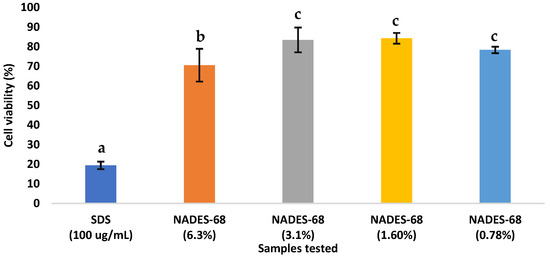 Cell viability (%) of L-929 fibroblast cells after 24 h exposure to SDS (100 µg/mL, positive control) and different concentrations of NADES-68 (6.3%, 3.1%, 1.6%, and 0.78%) expressed as final concentrations in the culture medium. Bars represent mean ± SD (n = 3). Different letters indicate statistically significant differences (p < 0.05).