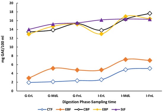The in vitro digestion simulation was performed following the procedure described by Torres-Martínez et al. [33], with slight modifications. In this study, two gastrointestinal conditions were simulated: fasting and postprandial states. The fasting state refers to the physiological condition in which no food has been consumed for an extended period, typically used as a baseline to assess compound stability without dietary interference [34]. In contrast, the postprandial state represents the period following food intake, during which digestive processes are actively engaged. Simulating both conditions allows for a more comprehensive evaluation of the behavior and bioaccessibility of phenolic compounds, since the presence of food components, such as proteins, lipids, and carbohydrates, can significantly influence the release, transformation, and absorption of bioactive molecules during digestion [35].