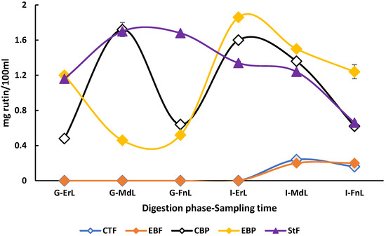 The consistent detection of rutin and quercetin at the end of the intestinal phase can be explained by their chemical structures and physicochemical interactions with the encapsulating matrix. Rutin, a glycosylated flavonol composed of quercetin and disaccharide rutinose, exhibits increased water solubility and enhanced stability against acidic hydrolysis and enzymatic degradation compared to its aglycone counterpart. Its bulky sugar moiety introduces steric hindrance, which limits its inhibitory interaction with digestive enzymes in the free form but favors stabilization when bound to starch or encapsulating agents [34]. In contrast, quercetin aglycone, although more susceptible to oxidative degradation, demonstrates moderate polarity that improves its dispersion and incorporation into micellar systems during digestion. Both flavonoids are known to form non-covalent interactions, such as hydrogen bonds and van der Waals forces, with dietary polysaccharides or encapsulants (e.g., maltodextrin, guar gum, and modified starch), resulting in the formation of protective complexes that slow their enzymatic degradation [80,81]. It should also be emphasized that digestion, through pH changes and enzymatic action, enhances the bioaccessibility of the metabolites of interest, as the concentrations detected in the ultrasound-assisted extracts were significantly lower (EChExT = 0.16 ± 0.00 mg rutin/100 mL isotonic beverage) when compared to those observed after digestion.