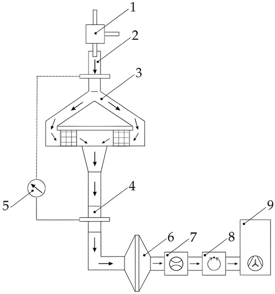 24]. The filter performance was assessed by replicating real-world particulate exposure through the generation of a standardized test aerosol, designed to simulate the typical dust composition encountered in the material’s intended operating environment. The aerosol was introduced at a controlled face velocity corresponding to nominal filter operating conditions. During the test the air flow rate was measured with uncertainty within ±2%, gauge pressure with uncertainty within ±1%. Moreover, thermodynamic parameters of air flowing through the filter were measured: temperature with an uncertainty of 0.5 °C, relative humidity (RH) with an uncertainty of ±2% RH and barometric pressure with an uncertainty of 0.3 kPa.