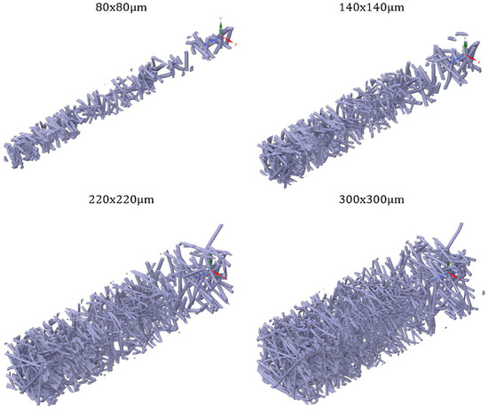Generation of numerical mesh and carrying out numerical computations of the entire object that is the product of a CT scan would need huge compute resources and would be very time consuming. For this reason, the original model was divided into smaller sections; however, this approach raises the issue of selecting an appropriate representative elementary volume (REV). Consequently, four geometries with a common center were extracted from the base model. These geometries differ from each other in their cross-sectional areas. Maintaining the original depth of the model, cutouts were made with side lengths of 80 μm, 140 μm, 220 μm and 300 μm.