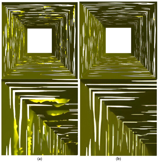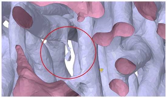 The geometry did not require repairs as was necessary in the case of CT scans. However, its characteristics led to the presence of sharp edges during later stages of geometry preparation, an effect that became evident during surface mesh generation. As in the paper filter model, inlet and outlet run-up sections were implemented in the mesh filter. To prevent reverse flow, the lengths of both sections were set to 300 µm.