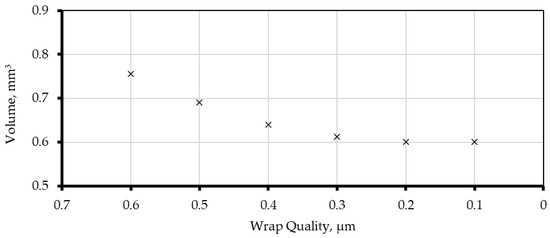 Figure 6 illustrates the relationship between shrinkwrap quality and total volume of fibers in the sample, showing that the total volume asymptotically approaches a constant value as the surface reconstruction quality improves (i.e., as the shrinkwrap quality parameter decreases).