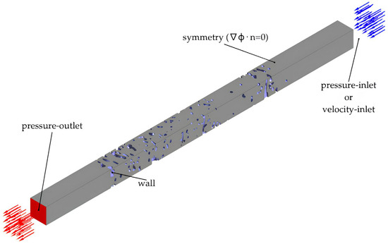 Assessment of the influence of the number and size of cells in the paper filter domain allowed to determine numerical values of approximate cell sizes, both maximum and minimum, in the local sizing settings. Test domains with larger sizes, i.e., 300 × 300 μm, were characterized by favorable mesh quality at maximum size settings of 40 μm and minimum size of about 0.4 μm. These settings, applied to the specific model tested, result in approximately 26 million cells. Smaller geometries, cut from the tomographic scan, retained adequate quality with the same maximum cell size as in the previous case. However, the minimum cell size had to be adjusted to the domain dimensions by implementing a value of 0.1. Average values for the number of cells for meshes with these settings reached 3.5 million, depending on the test sample.