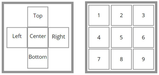 Numerical calculations of the pressure drop through the filter geometry, reconstructed from the original scan, were validated against experimental data. Because the full geometry (1024 × 1024 µm) would have required prohibitively high computational resources, the analysis was restricted to five 300 × 300 µm slices extracted from the center as well as the upper, lower, left, and right regions. To further resolve local variations, the central slice was subdivided into nine equal regions of 100 × 100 µm each. The specific areas of all geometries analyzed are shown in