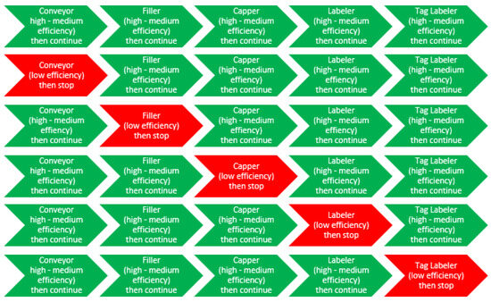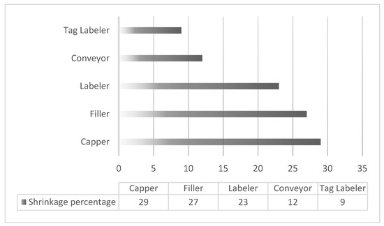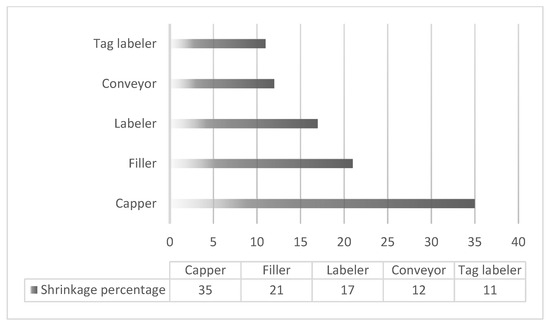 In the context of minimizing production losses in the liquor industry, various strategies have been proposed, including modifications to packaging materials and adjustments to filling parameters. As supported by studies [19,20], production losses may occur at multiple stages of the process, adversely affecting operational efficiency and increasing costs. However, the present study identified that the stages most strongly associated with waste generation are those involving the handling of bottles.