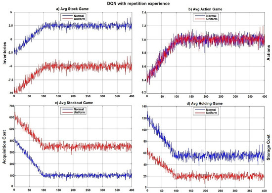 The results of the Deep Q-Network (DQN) method with experience replay are illustrated in Figure 2 In this figure, the outcomes under the normal distribution are represented by a blue line, while those under the uniform distribution are depicted in red. The average cost is notably higher under the uniform distribution compared to the normal distribution. Nevertheless, the agent’s actions (i.e., the electricity generator’s decisions) were consistent across both demand distribution types. It is important to highlight that, due to the inherent variability of the uniform distribution, electricity storage costs increase due to the variability in the lighting system’s electricity demand across the facility, resulting in a negative average inventory level. The behavior of the state variables throughout the training process is depicted in Figure 5a–d.