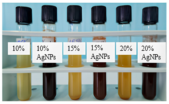 The flourishing green synthesis of AgNPs using the propolis extracts was confirmed by color change and spectroscopic studies of the reaction medium and nanoparticles. After a mixture of propolis extracts and silver nitrate, it showed an apparent color change from light cream to dark brown (Figure 1). Considering the different types of propolis concentration, 10%, 15%, and 20% extracts were the lightest, and the darkest extracts in each category were 10% AgNPs, 15% AgNPs, and 20% AgNPs. The literature data suggest that the darker propolis typically has a higher concentration of polyphenols, higher antioxidants, and antimicrobial activities [52].
