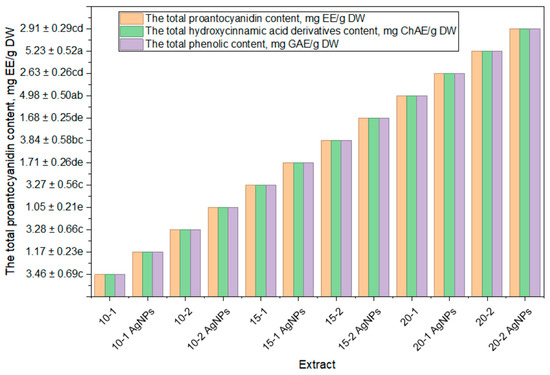 Visualization of phytochemical analysis of propolis extracts and propolis/AgNPs. Lowercase letters indicate the significant differences statistically between the total proantocyanidin, hydroxycinnamic acid derivatives and total phenolic content of plant extracts (p < 0.05).