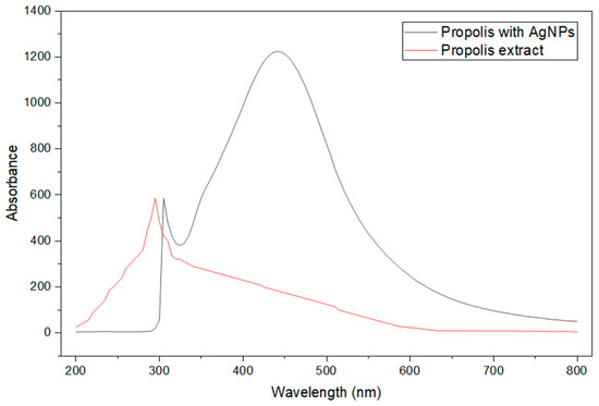 UV-Visible spectra of propolis and propolis with silver nanoparticles.