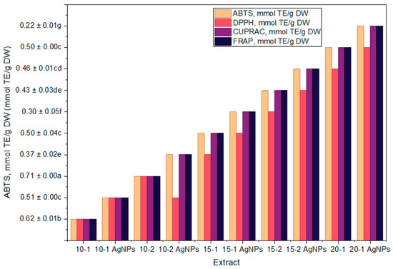 Visualization of antioxidant activity of propolis and propolis/AgNPs. Lowercase letters indicate the significant differences statistically between the different antioxidant activities of plant extracts (p < 0.05).