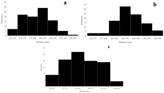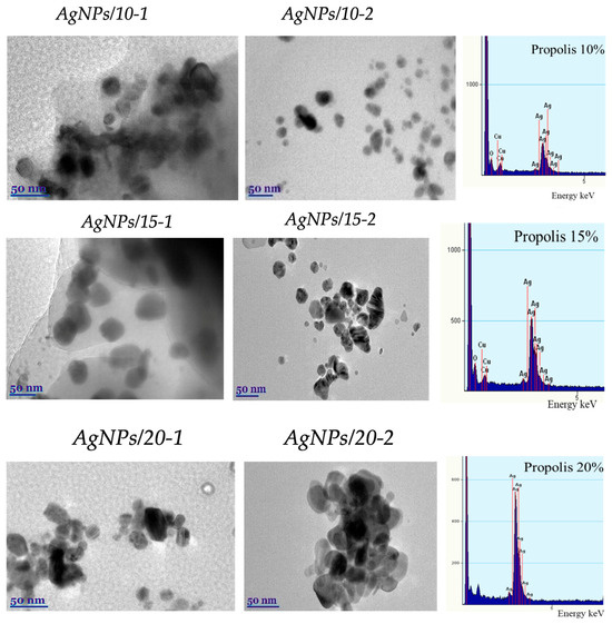 TEM and TEM-EDS examined the morphology, shape, and size of synthesized propolis/AgNPs. It can be found in the scientific literature that the type of plant extract, or other natural reducing agent, and its concentration influence the morphology of the nanoparticles formed. In contrast, the pH and temperature of the extract medium control the growth and size of the nanoparticles [60]. TEM images clearly show that the synthesized silver nanoparticles are predominantly spherical and below 50 nm in size (Figure 5). We can observe that the type of extract and its concentration affect the shape of silver nanoparticles. Particle size distribution histogram of different concentration of propolis is presented in Figure 6.