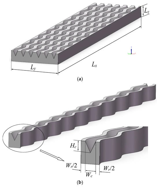 The VWM heat sink consists of several microchannels with the same structure, as depicted in Figure 1a. Therefore, only a structure unit containing a VWM and two half-fins is employed as the calculation domain, as depicted in Figure 1b.