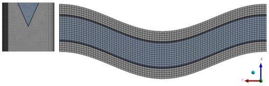 As shown in Figure 3, the hexahedral mesh is divided using the Workbench Mesh Module. According to the literature [16], accurately resolving the boundary layer is essential. Therefore, y+ ≈ 1 is taken in the wall region. To verify the mesh independence, three different types of microchannels (A0.1 mm–λ5 mm, A0.3 mm–λ5 mm and A0.3 mm–λ10 mm) are established, and for each type, four different mesh sizes (ultrafine, fine, medium and coarse) are determined by using Richardson’s extrapolation method. Then, Nuave and fave are compared, as depicted in Table 3. The results show that the differences between Nuave and fave with fine grids and those with ultrafine grids are less than 0.5% and 0.25%, respectively, for any type of microchannel. Comprehensively considering both the prediction accuracy and the calculation speed, the fine mesh is employed in the present study.