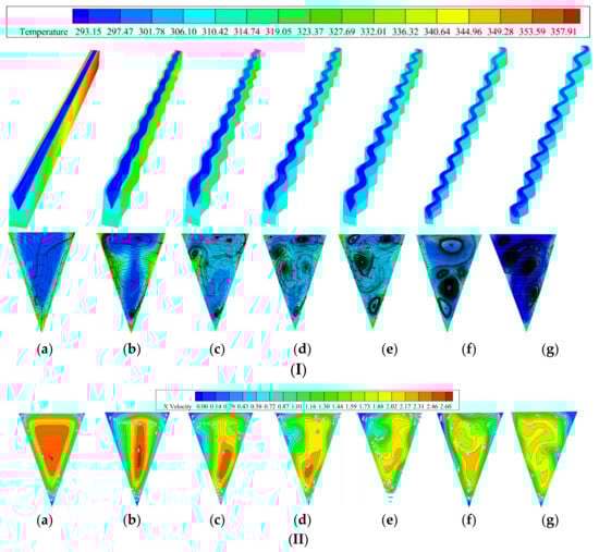 The fluid streamline contours in a period of wave are observed, as depicted in Figure 16. In the RSM, the fluid streamline is almost exactly the same and no Dean Vortexes emerge. In the VSM, the fluid streamline changes slightly and only a few Dean Vortexes emerge at the microchannel bottom. In the VWM, the Dean Vortexes change periodically. When the microchannel curvature achieves its maximum value (at the wave peak and wave valley), the area, number and severity of the Dean Vortexes also reach their maximum values. As the microchannel curvature decreases, the Dean Vortexes gradually disappear. As a result, the VWM has a much thinner thermal boundary layer than the VSM and RSM.