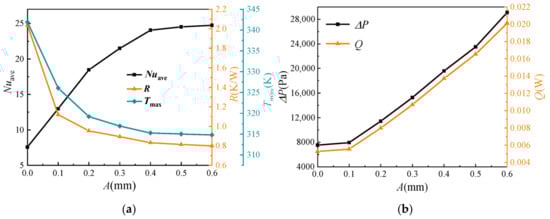 The influences of A on the maximum temperature Tmax, average Nusselt number Nuave, thermal resistance R, pressure drop ΔP and pump power Q are studied when λ = 5 mm and u = 1.4 m/s, as depicted in Figure 5 and Figure 6. As many the Dean Vortexes emerge, the wavy microchannel shows a smaller high temperature area and a more uniform temperature than the straight microchannel. When A increases from 0 mm to 0.6 mm, as the water flow turns more sharply, the area, number and severity of the Dean Vortexes increase, which not only promotes fluid mixing but also thins the thermal boundary layer. Consequently, Tmax and the high temperature area gradually decrease. Moreover, Nuave increases while R and Tmax decrease with the increase in A. When A increases from 0 mm to 0.6 mm, Nuave increases from 7.57 to 24.75, R decreases from 2.04 to 0.80 and Tmax decreases from 341.93 K to 314.80 K, respectively. However, the change rates of Nuave, R and Tmax slow down because the thermal boundary layer is impossible to be thinned infinitely. As the number, area and severity of the Dean Vortexes increase and the flow path length increases with the increase in A, the flow resistance also increases, which leads to an increase in ΔP and Q and a decrease in fluid velocity. When A increases from 0 mm to 0.6 mm, ΔP increases from 7522.50 Pa to 29,102.43 Pa and Q increases from 0.0053 W to 0.0201 W, respectively.