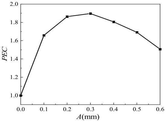 As A increases, both Nuave and ΔP increase. When A < 0.3 mm, the PEC increases with the increase in A, showing that Nuave has a larger increase rate than ΔP, as depicted in Figure 7. When A > 0.3 mm, the PEC decreases with the increase in A, showing that ΔP has a larger increase rate than Nuave. Eventually, PEC achieves its maximum value when A = 0.3 mm.