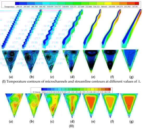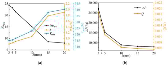 The influence of λ on Tmax, Nuave, R, ΔP and Q is studied when A = 0.3 mm and u = 1.4 m/s, as depicted in Figure 8 and Figure 9. When λ increases from 3 mm to ∞, as the water flow turns more slowly, the area, number and severity of the Dean Vortexes decrease, which not only weakens fluid mixing but also thickens the thermal boundary layer. Consequently, Tmax and the high temperature area gradually increase. Moreover, Nuave decreases while R and Tmax increase with the increase in λ. When λ increases from 3 mm to 20 mm, Nuave decreases from 24.37 to 7.99, R increases from 0.81 to 1.91, and Tmax increases from 315.07 K to 340.54 K, respectively. However, as λ increases from 15 mm to 20 mm, the change rates of Nuave, R and Tmax slow down because the thermal boundary layer is impossible to be thickened infinitely. As the number, area and severity of the Dean Vortexes decrease and the flow path length decreases with the increase in λ, the flow resistance also decreases, which leads to a decrease in ΔP and Q and an increase in fluid velocity. When λ increases from 3 mm to 20 mm, ΔP decreases from 27,304.92 Pa to 7944.70 Pa and Q decreases from 0.0187 W to 0.0056 W, respectively.