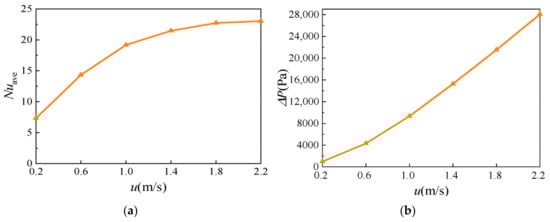 The influence of u on Nuave and ΔP is studied when A = 0.3 mm, λ = 5 mm, as depicted in Figure 11 and Figure 12. When u increases from 0.2 m/s to 2.2 m/s (Laminar flow is considered as Reynolds number is no larger than 2196), the area, number and severity of the Dean Vortexes increase, which not only promotes fluid mixing but also thins the thermal boundary layer. Consequently, both Tmax and the high temperature area gradually decrease. Moreover, Nuave increases with the increase in u. However, the change rates of Nuave are slowing down because the thermal boundary layer is impossible to be thinned infinitely. In contrast, the area, number and severity of the Dean Vortexes continuously increase with the increase in u, leading to a rapidly increase in ΔP.