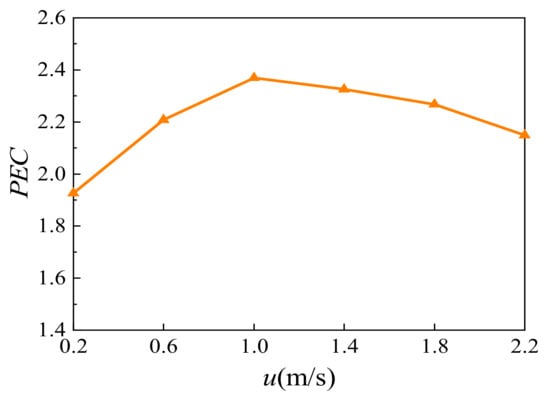 As u increases, both Nuave and ΔP increase. When u < 1.0 m/s, the PEC increases with the increase in u, showing that Nuave has a larger increase rate than ΔP, as depicted in Figure 13. When u > 1.0 m/s, the PEC decreases with the increase in u, showing that ΔP has a larger increase rate than Nuave. Eventually, PEC achieves its maximum value when u = 1.0 m/s.