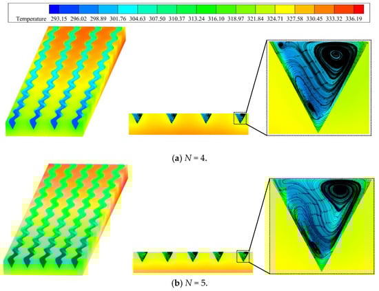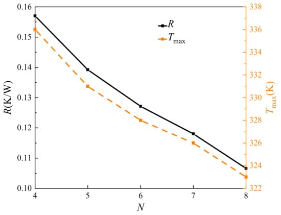 For a VWM heat sink, the microchannel number N also affects the heat transfer property. Therefore, the influence of N on R and Tmax is studied when A = 0.3 mm, λ = 5 mm and Q = 0.163 W, as depicted in Figure 14 and Figure 15. When N increases from 4 to 8, both the heat transfer area and the total number of Dean Vortexes increases. Therefore, both Tmax and the high temperature area gradually decrease with the increase in N. Moreover, both Tmax and R decrease with the increase in N, and they reach their minimum values at N = 8 in the present study.